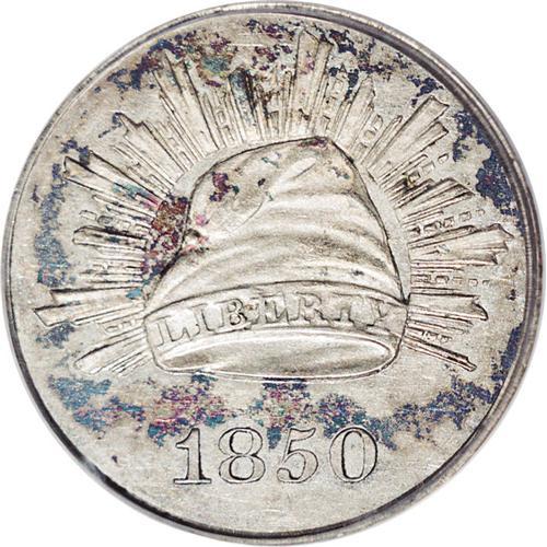 <B>1850 P3CS Three Cent Silver, Judd-125 Original, Pollock-147, R.4, PR63 PCGS.</B></I> On the obverse, a glory of rays surrounds a cap inscribed LIBERTY, with the date below. On the reverse, a palm branch encircles the denomination III with the legend UNITED STATES OF AMERICA around. Struck in silver with a plain edge. The obverse was originally designed by Christian Gobrecht for the 1836 gold dollar, and this later variant was executed by Franklin Peale from designs by Longacre. This is a lovely example that transcends the PR63 grade. The fields are bright with mirror-like reflectivity. Both sides are generally light in color with occasional dabs of multicolored iridescence that adds even more to the overall visual appeal of this widely collected pattern.<BR><BR><b>Shipping:</b> Coins & Currency (<a target="_blank" href="http://www.heritageauctions.com/common/shipping.php">view shipping information</a>)
