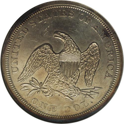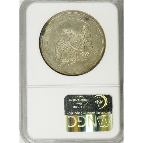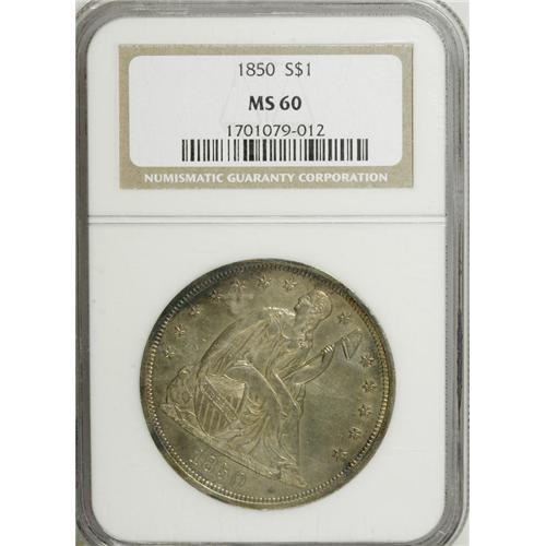 <B>1850 S$1 MS60 NGC.</B></I> This evenly struck and satiny representative has frosty devices and medium straw-gold patina. The borders exhibit glimpses of mauve and cobalt-blue. Only 7,500 pieces were struck, few of which have survived in Mint State. Census: 4 in 60, 25 finer (3/07).<BR><BR><b>Shipping:</b> Coins & Currency (<a target="_blank" href="http://www.heritageauctions.com/common/shipping.php">view shipping information</a>)