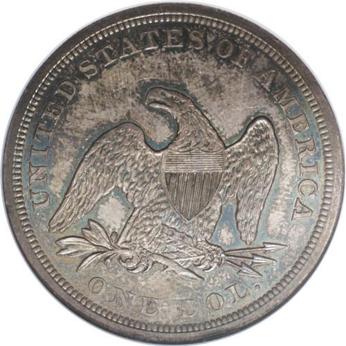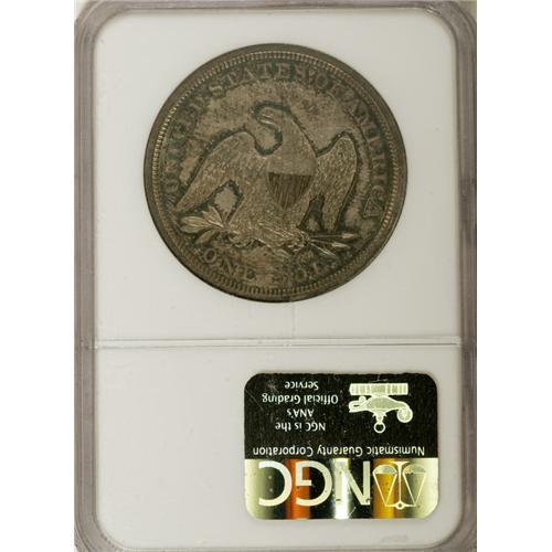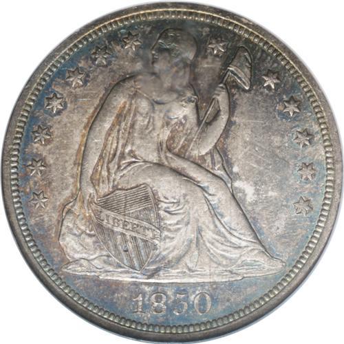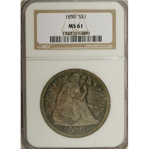 <B>1850 S$1 MS61 NGC.</B></I> Breen-5443. The 1850 is a challenging issue among Seated dollars. Only 7,500 pieces were produced, due to the introduction of the gold dollar in 1849, the large number of gold dollars produced in 1850, and the rising price of silver in terms of gold, caused by the California Gold Rush. A good number of the 1850 silver dollars produced were melted, leaving no more than 200 coins available today in all grades, with Mint State pieces especially difficult to locate.<BR> The base of the 0 in the date is repunched, and there are die file marks below the 50 in the date. Both sides display a coating of original blue-gray patina, and the strike is well above average. The fields are typically abraded and have a few wispy handling marks. Most of the relatively few survivors grade only XF45 to AU55. Uncirculated specimens are considered scarce. Census: 13 in 61, 12 finer (1/07).<BR><BR><b>Shipping:</b> Coins & Currency (<a target="_blank" href="http://www.heritageauctions.com/common/shipping.php">view shipping information</a>)