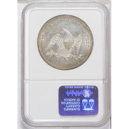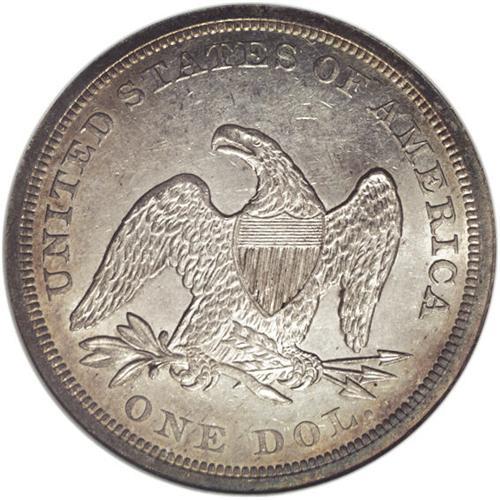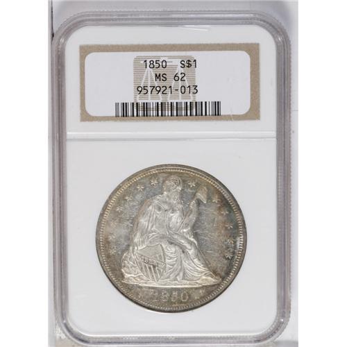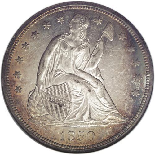 <B>1850<img border='0' src='http://www.heritagecoins.com/images/star.gif' width=10 height=10>$1> MS62 NGC.</B></I> The reflective surfaces have pleasing gold patina over both sides, with violet that appears in the right obverse field. The ivory-toned devices are boldly struck, though a trace of weakness is noted on the eagle's wings. Though some marks in the field restrict the grade, this piece is still important. Census: 6 in 62, 5 finer (7/06).