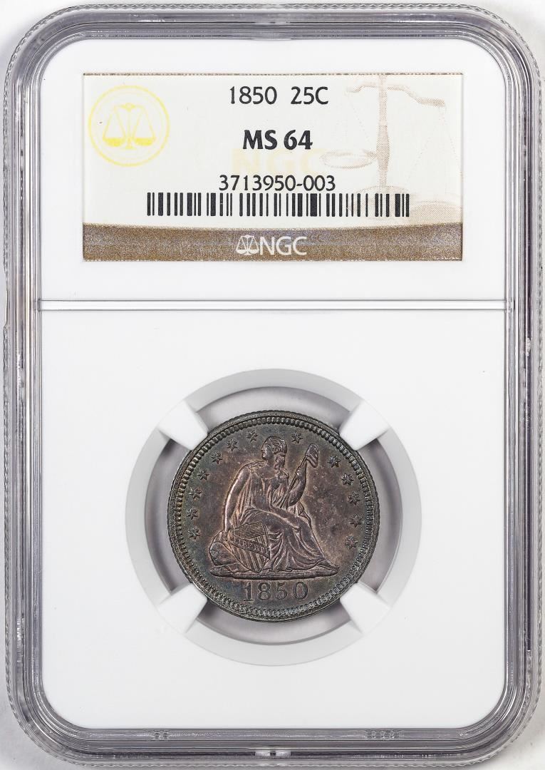 One 1850 Seated Liberty Quarter Coin NGC MS64 Great Toning. NGC Certified.