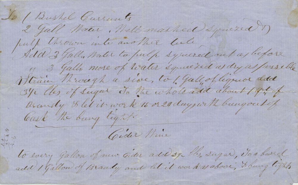 A quirky piece of oenophilia, a recipe for wine penned ca. 1850 on a small blue sheet. The concoction calls for, in part: "...1 Bushel Currants 2 Gall Water, Well Washed squezed & pulp thrown into the tub. Add 3 Gall water to pulp squeezed out before & 3 Galls more of Water squeezed as dry as possible. Strain through a sive w/ Gall of liquid add 3 1/2 lbs of sugar. To the whole add about 1 qt. of brandy & let it work 15 or 20 days with bung out of cask the bung tight". We tried this at Alexander, with excellent results! Light staining, very good.