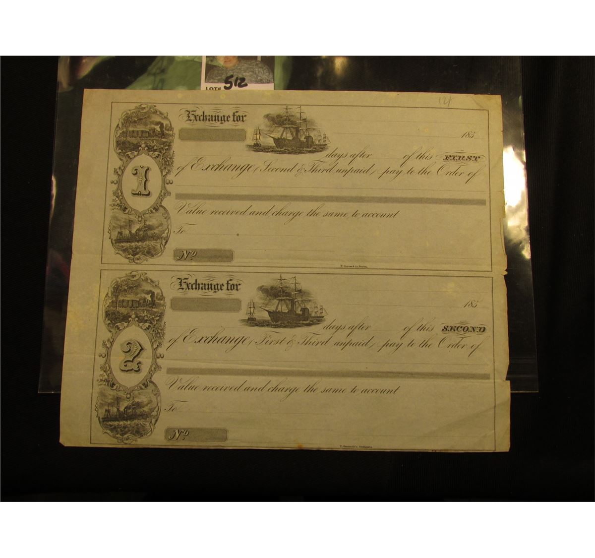 1850 era "Exchange Notes" Unissued. The first is for "Second & Third Unpaid" and the latter is for "First & Third unpaid". Both depict Paddle Wheelers and Sailing Ships.