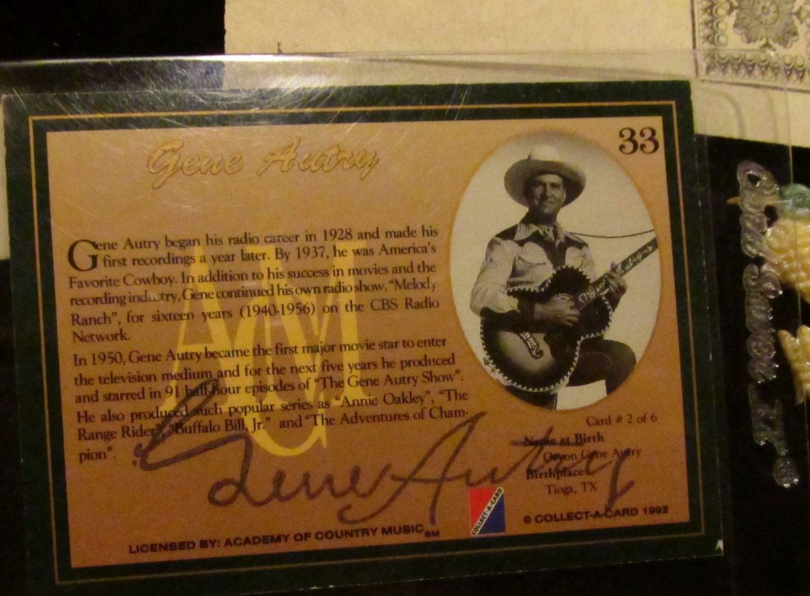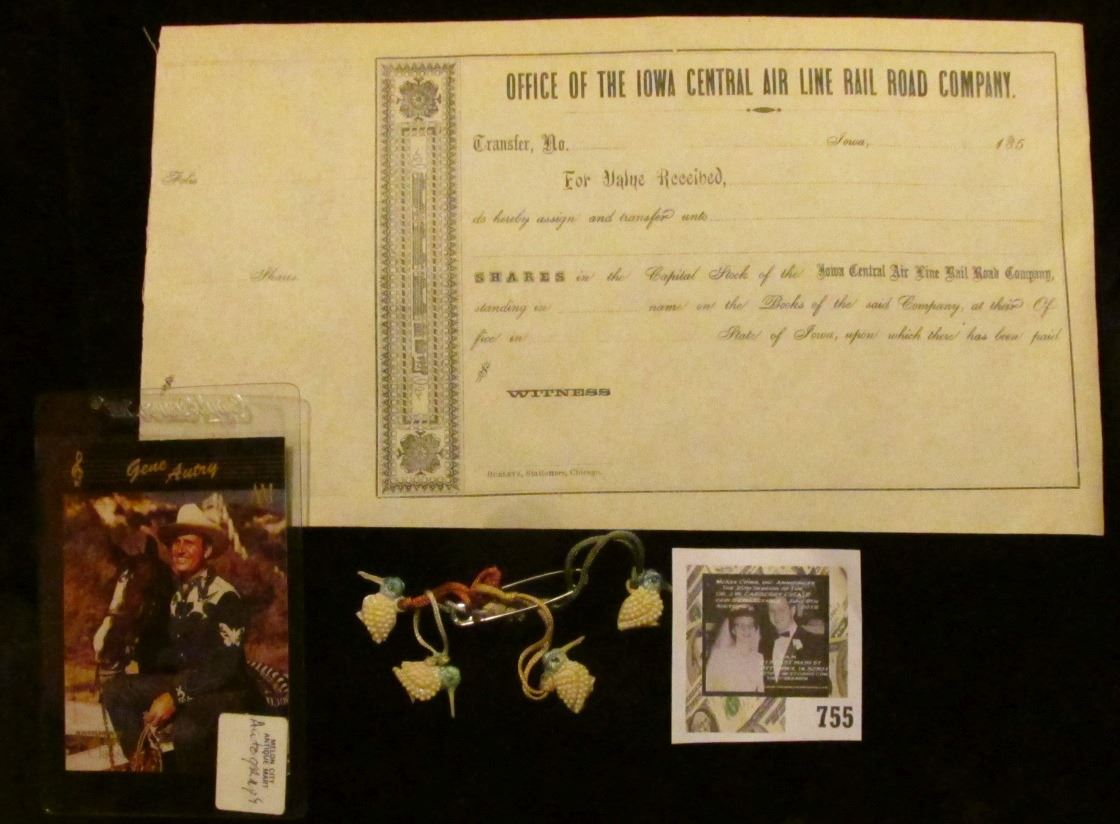 1850 era unissued Stock Certificate from "Office of the Iowa Central Air Line Rail Road Company"; and an autographed Collector's Card of and by Gene Autry.