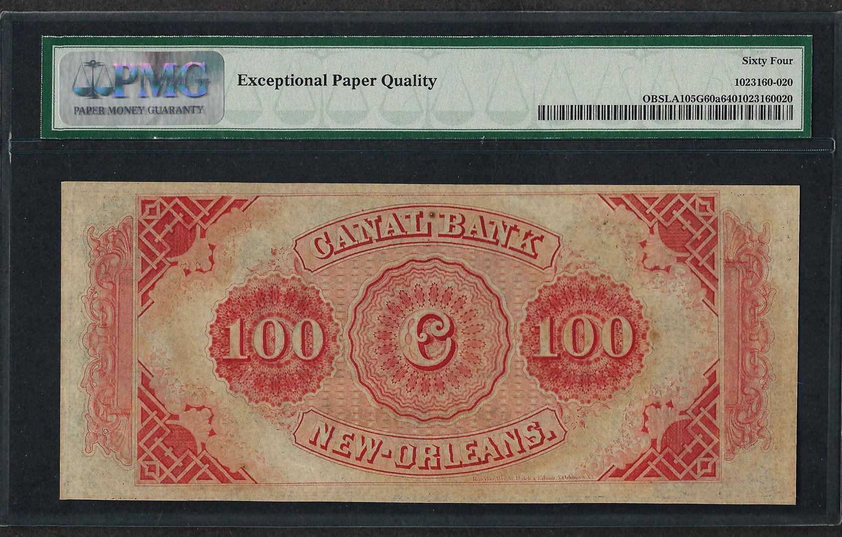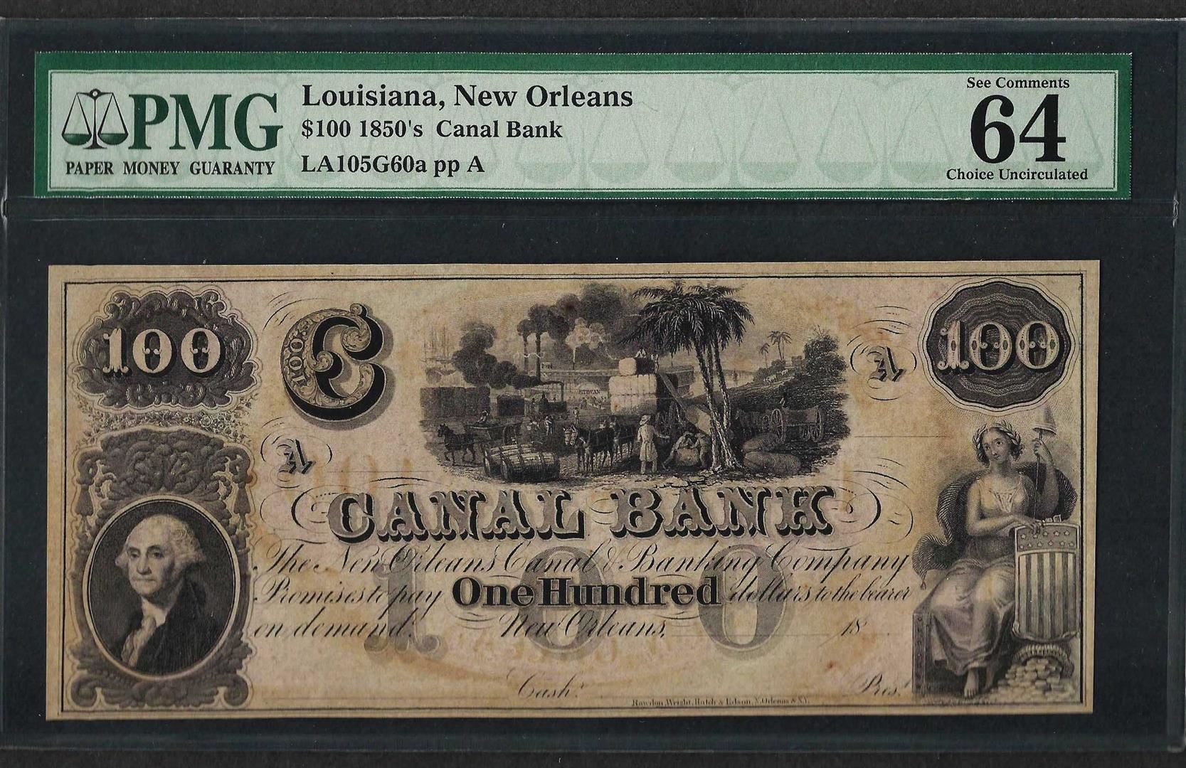 One 1850's $100 Canal Bank New Orleans Obsolete Note PMG Choice Uncirculated 64EPQ. PMG Certified.