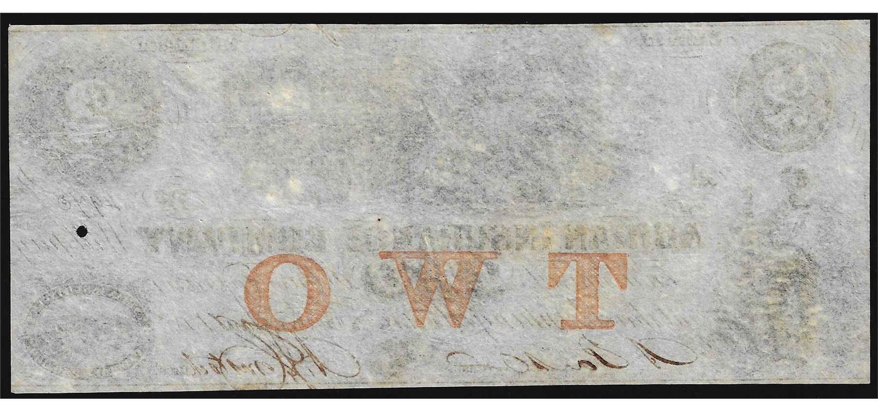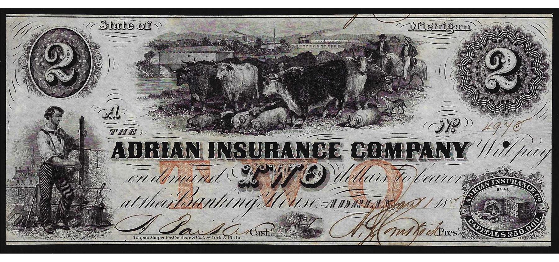 One 1850's $2 Adrian Insurance Company Obsolete Bank Note.