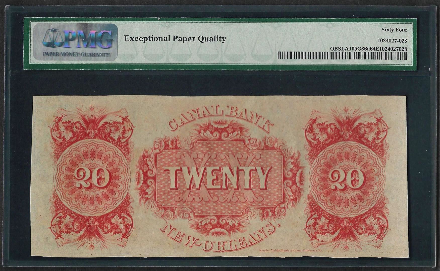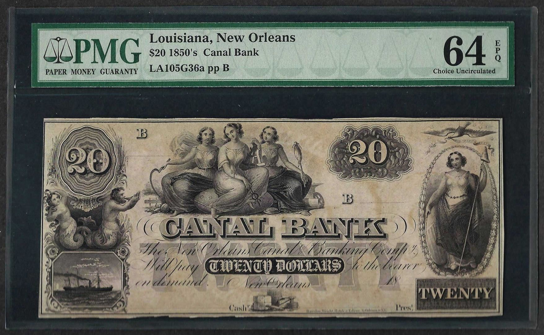 One 1850's $20 Canal Bank New Orleans Obsolete Note PMG Choice Uncirculated 64EPQ. PMG Certified.