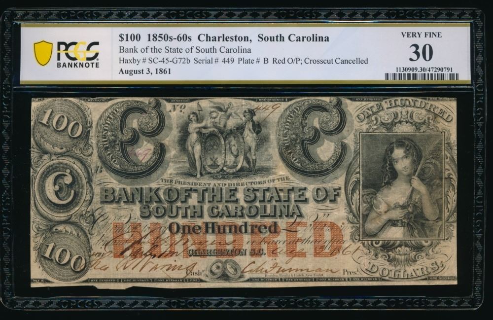 One 1850's-60's $100 Charleston SC Obsolete PCGS 30.
