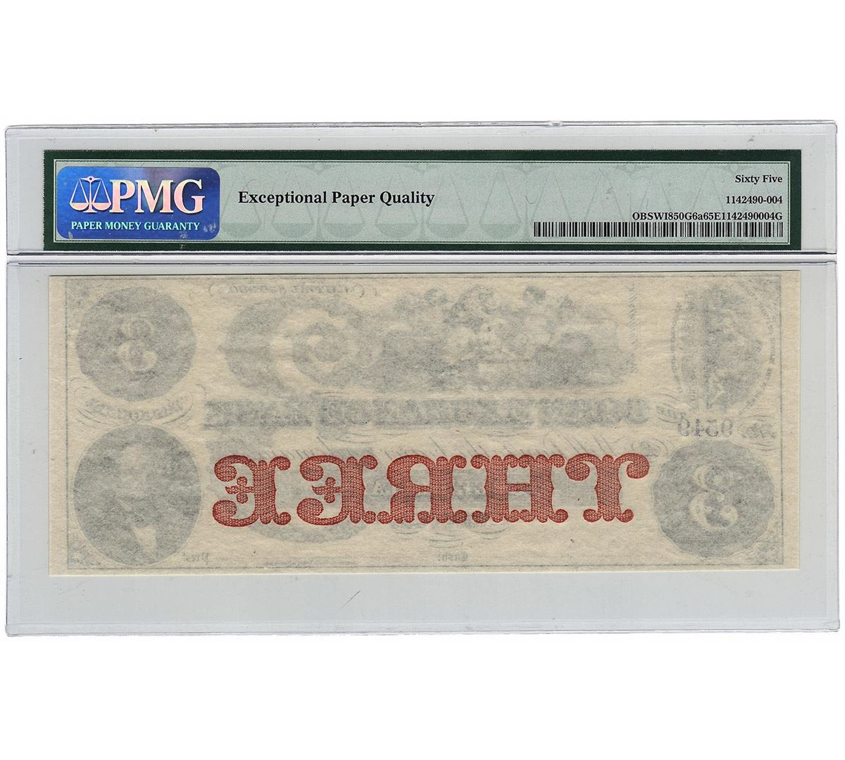 One 1850's-60's $3 Corn Exchange Bank Wisconsin Waupun Obsolete Currency Note PMG Graded Gem Uncirculated 65EPQ. PMG Certified.