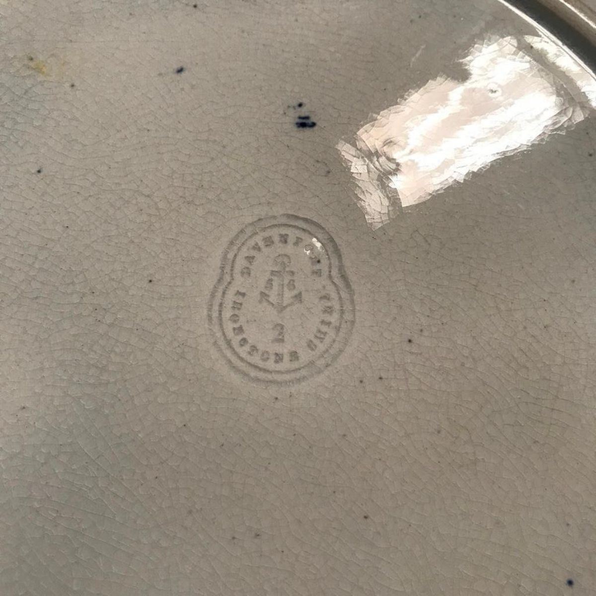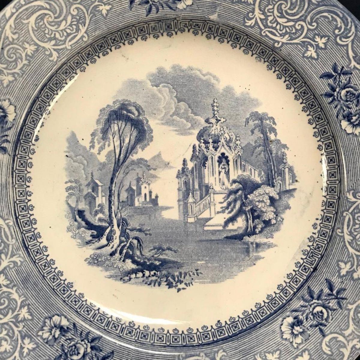 1850's gothic revival, blue transfer ware ironstone plate. Stamped on the reverse, "Davenport, Ironstone, China, 56 " with an anchor. 10 1/2" D. Provenance; display piece from an 1850's South Carolina plantation house museum.Â
