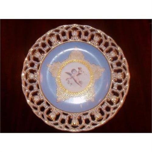 This is a very rare Jacob Petit style Old Paris porcelain cabinet plate. The plate is beautifully hand painted with a flying cupid dropping pink roses. Around the cupid is gold gilt scrolls and a pierced Rococo Revival strapwork edge. Very good condition with some wear to paint. 9" in Diam.