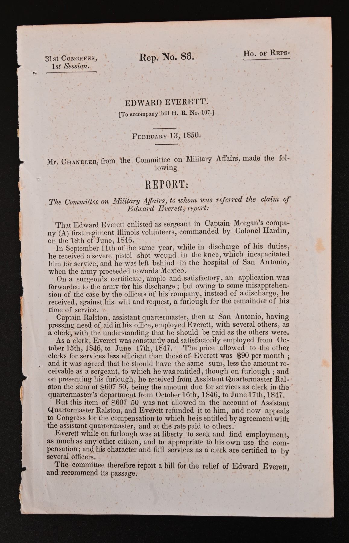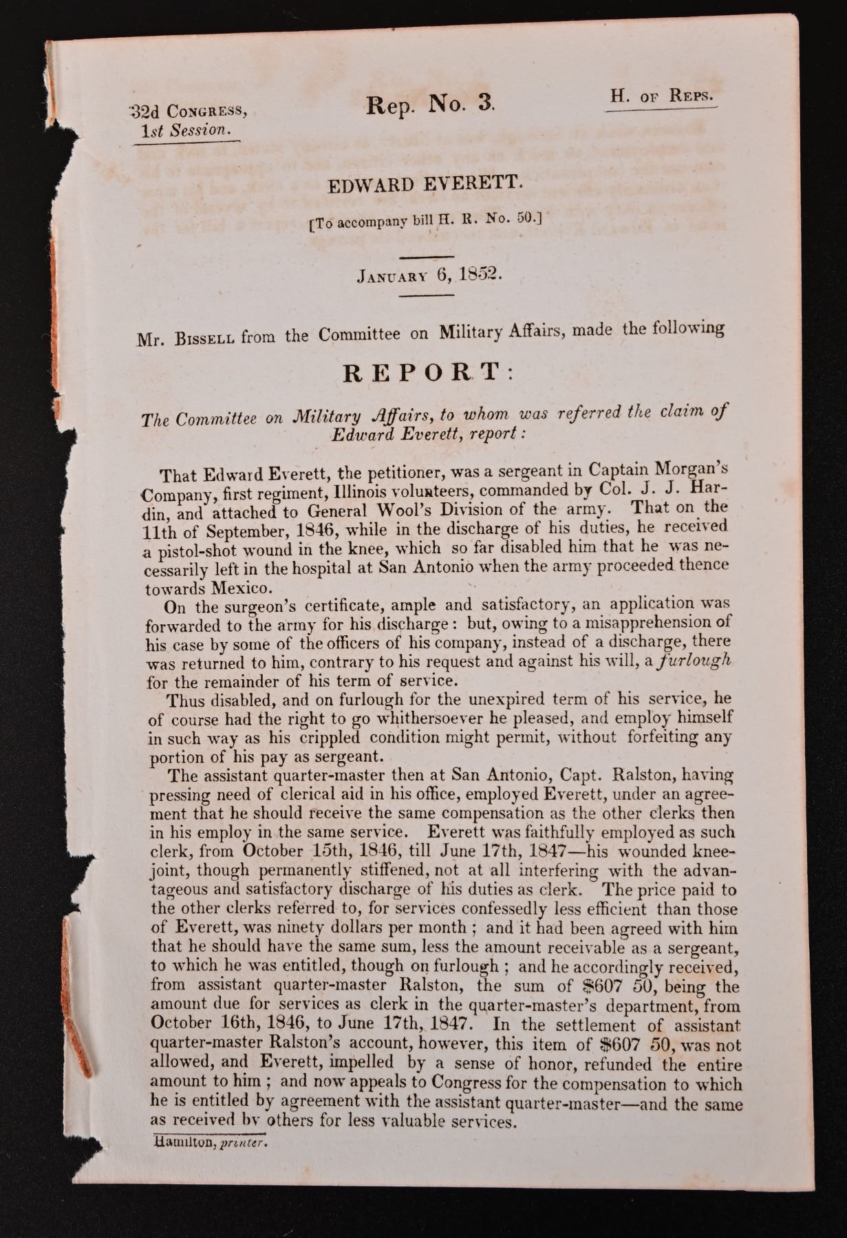 31st Congress, 1st session, February 13, 1850. Detailing affairs of Edward Everett and back pay owed after accepting a new detail after being wounded. 32nd Congress, 1st session, dated January 6, 1852. Continuation of report for request of granting Edward Everett his back pay.