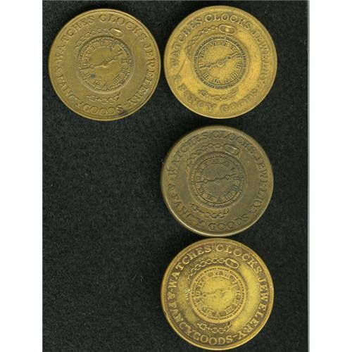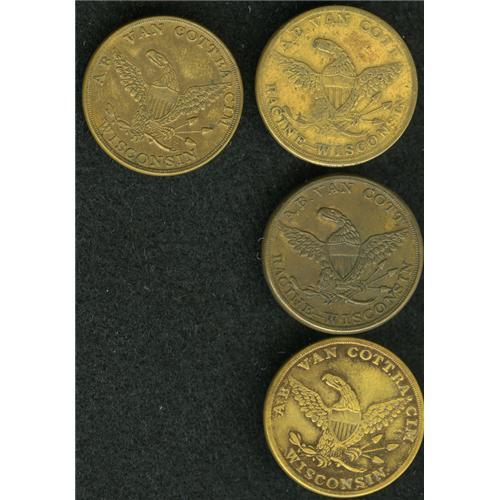 <B>(1850s) Racine, Wisconsin, A.B. Van Cott Group Lot.</B></I> Consists of four merchant's tokens, all by the same person. Listed on page 406 of the Rulau standard reference catalog as Wis-11, Wis-12, Wis-13, Wis-14, averaging XF/AU. A great opportunity to obtain all four types at one time.