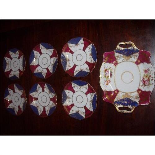 This is a very fine mid 19th century Old Paris High style porcelain dessert service in the Rococo Revival style. This kind of ornate Paris porcelain was a big part of 19th century Southern culture and used in the fine dinning rooms of plantation homes and townhouses in the deep South from Mobile Alabama to New Orleans Louisiana and Up to Natchez Mississippi, Where lots of it can still be seen today. The six beautiful plates have nice scalloped edges with a Burgundy red and royal blue painted on the plates and serving platter with overlay of gold gilt Rococo scrolls . The platter have beautifully painted garden flowers with ornate acanthus leaf handles highlighted in gold gilt. The platter is 12" x 9"and the plates are 8". Condition: Good.