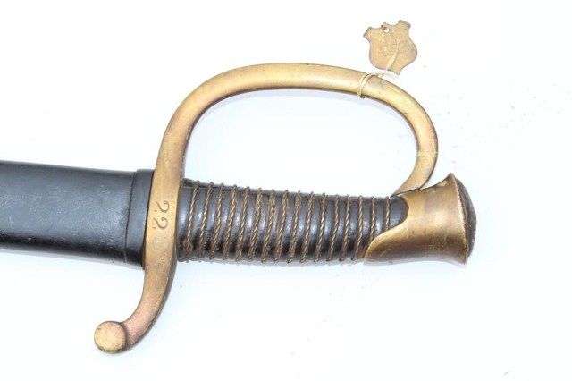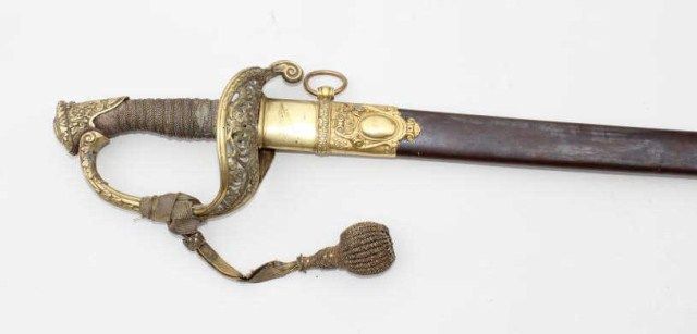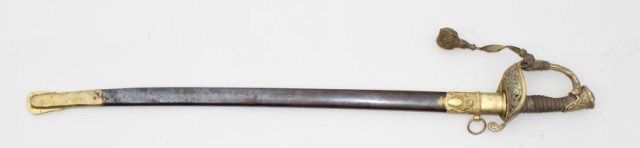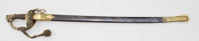 1850’s style U.S. Officers sword with Clauberg blade and fancy mounts; scabbard period script inscribed “Presented to Capt. Thomas Kendall by Members of Co. B 21st N.J. Vol., July 1, 1863”. The sword is in goodoriginal condition showing some light polishing and cleaning; the body of the scabbard shows considerable original brown finish; grip is very good; blade shows most etching and a gray patina; carried and usedbut cared for; a nice Civil War inscription; blade is 32” and sword is 38-1/2” overall. From an old collection in Auburn, CA in the heart of the Gold Country. Est.: $2,000-$4,000.