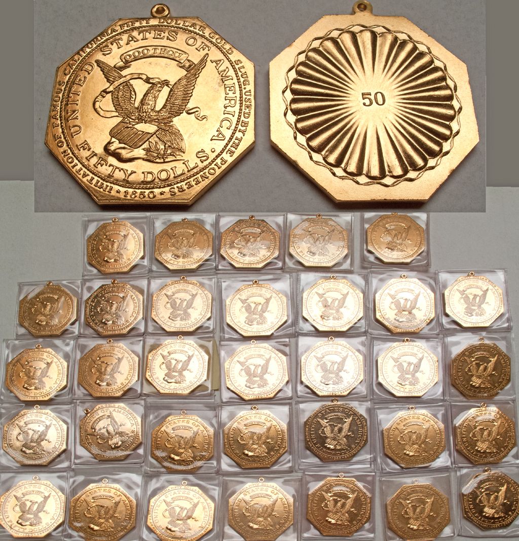 Lot of 33. These are 1960's gilt facsimiles of the $50 of the target reverse slug with loop from the Bill Weber Collection. Obverse has eagle with '000 THOU' above its head. Reverse has 22 rays with a continuous ribbon around outer edge. High quality strikes are scarce. Come look at these samples. AU-BU. Bill Weber Collection. City: County: State: CADate: c1960's