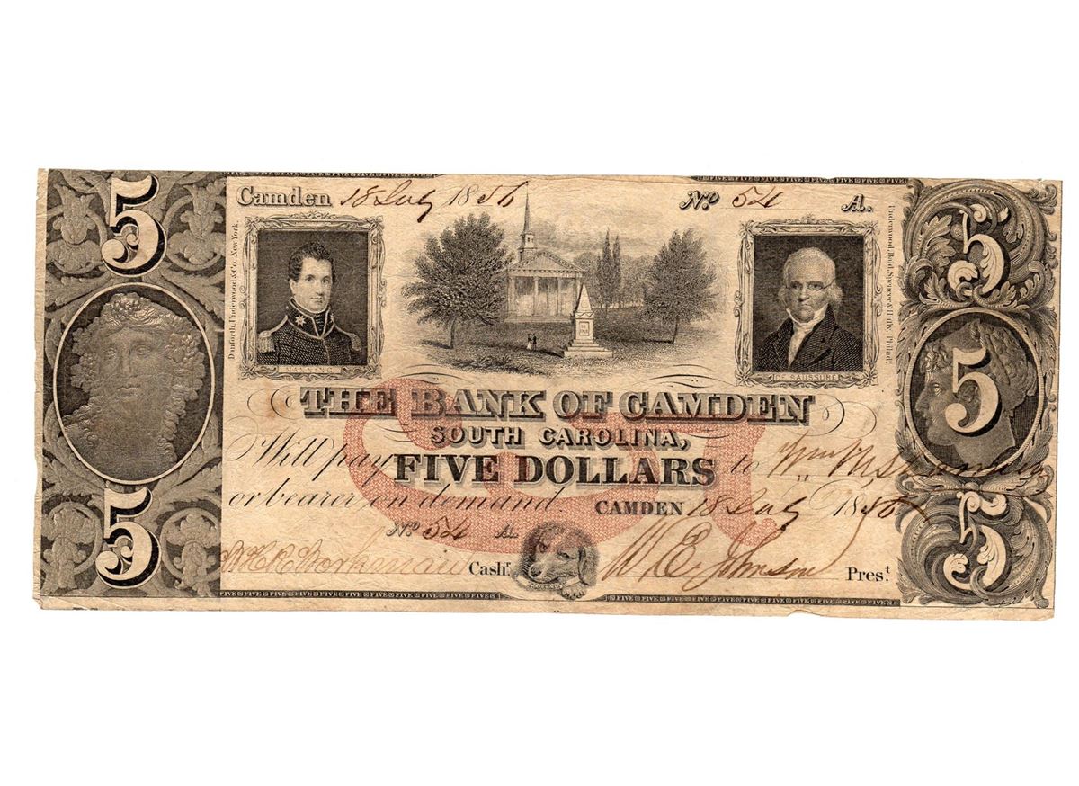 One 1850s $5 The Bank of Camden Obsolete Bank Note.