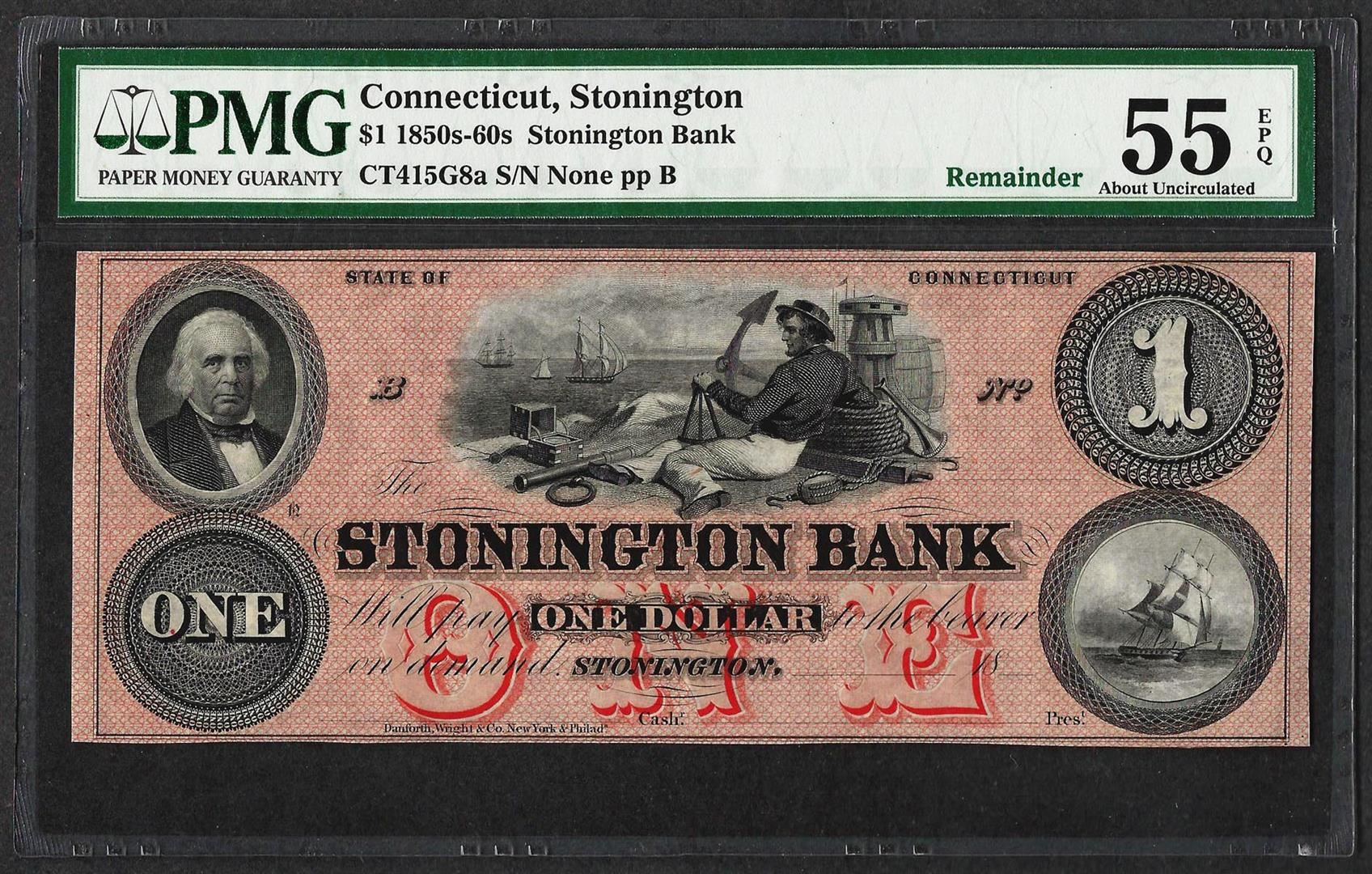One 1850s-60s $1 Stonington Bank Connecticut Obsolete Note PMG About Uncirculated 55EPQ. PMG Certified.