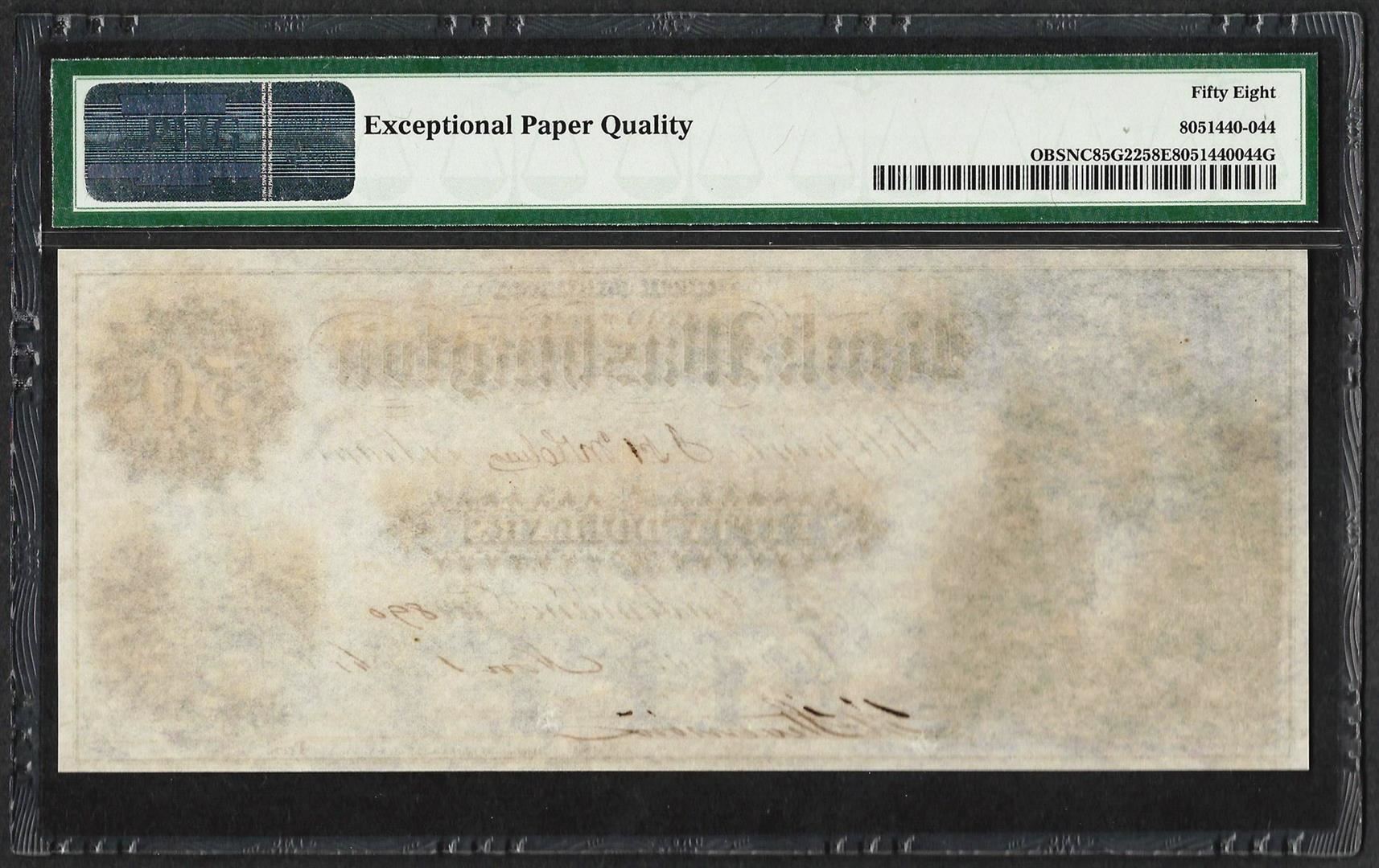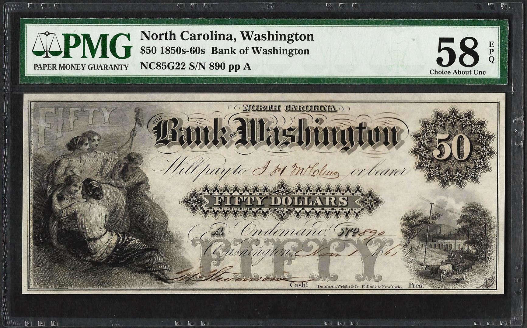 One 1850s-60s $50 Bank of Washington, NC Obsolete Note PMG Choice About Unc. 58EPQ. PMG Certified.