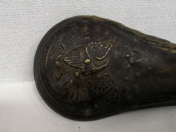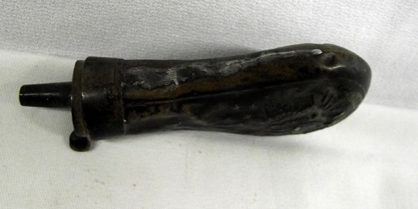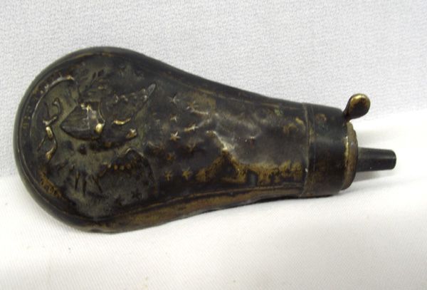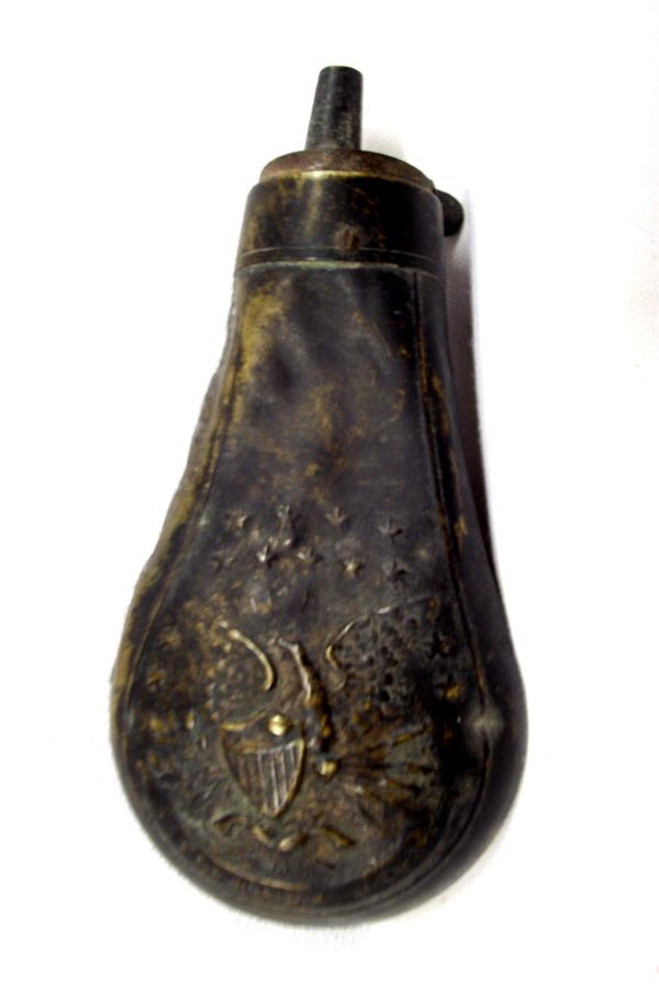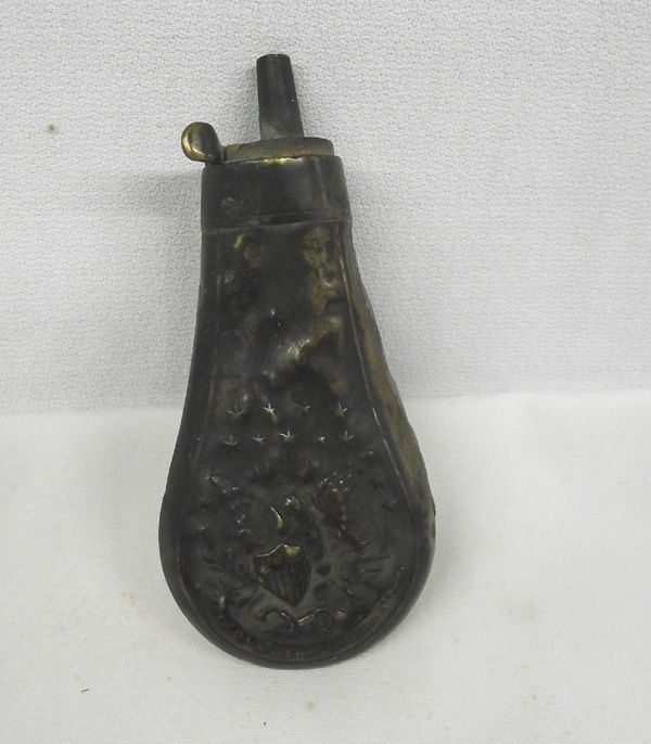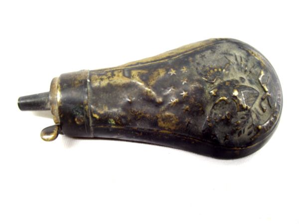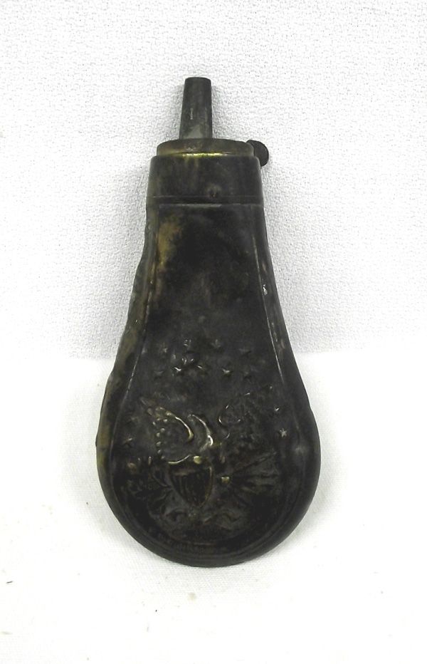 1850s Brass Double Eagle Colt M1849 Powder Flask. Original brass pistol powder flask for M1849 Colt revolver. Double eagles and shield. ''E Pluribus Unum'' is under the crossed pistols. Overall length without spout is 3-7/8 inches. The spring does work. The flask is bent on both sides and has been soldered on one side seam.