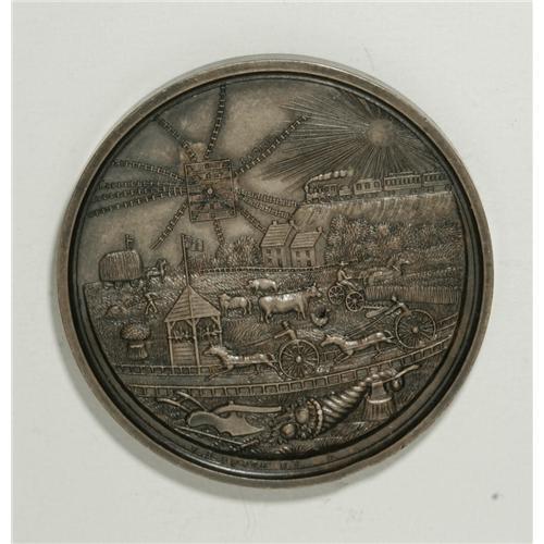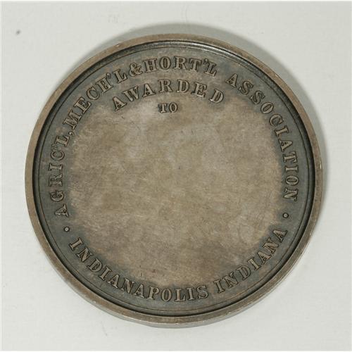 <B>(1850s) Indianapolis, Indiana, Agric'l Mech'l & Hort'l Association Silver Award Medal.</B></I> An uncertified AU50 award medal that is unengraved. The die-sinker for this medallion was F.B. Smith from New York. The medallion measures approximately 44 mm and weighs 44.5 gm. A wonderful example of engraving, this medal has it all, from trains and a farming scene to trotters racing in the foreground.<BR><BR><b>Shipping:</b> Coin/Currency (<a target="_blank" href="http://www.heritageauctions.com/common/shipping.php">view shipping information</a>)