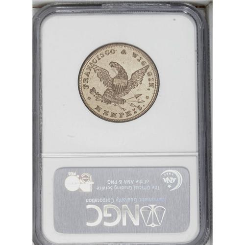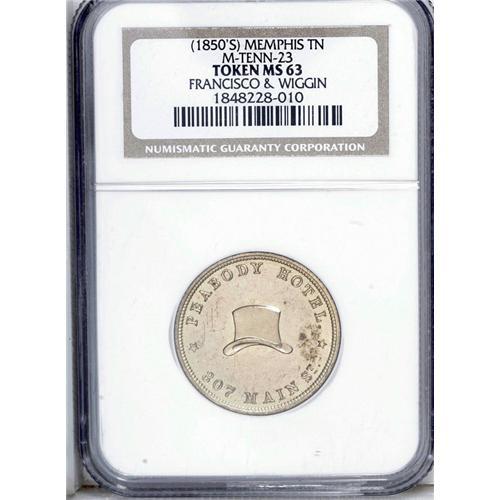 <B>(1850s) Memphis Tennessee Francisco & Wiggin Hard Times Token, MS63 NGC.</B></I> Brass, 29mm, plain edge, listed in Rulau as Miller Tenn-23. Obverse: eagle with wings spread; Francisco & Wiggin / Memphis, around. Reverse: Peabody Hotel / (hat) / 307 Main St. *. Small blemish at 3 oclock on reverse.