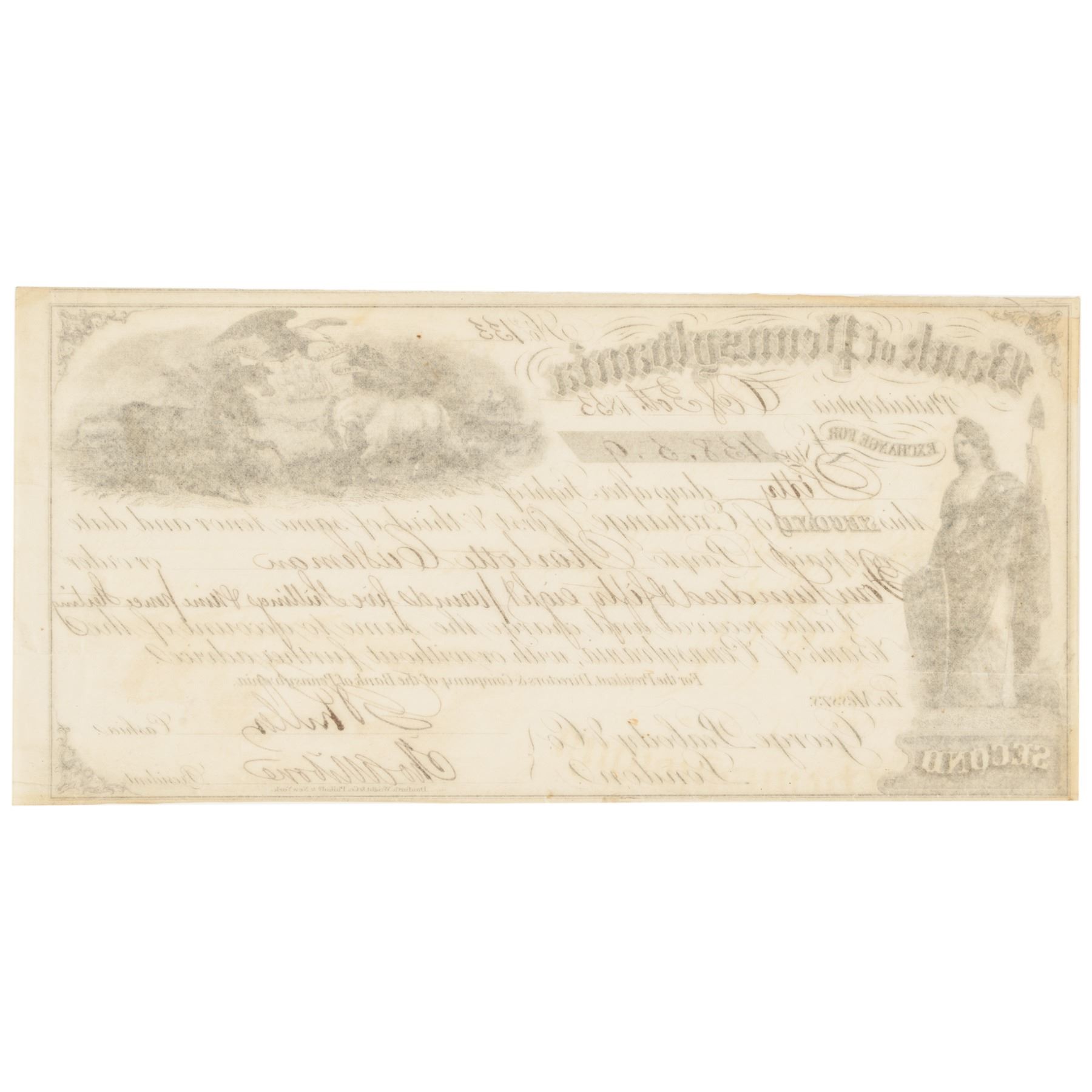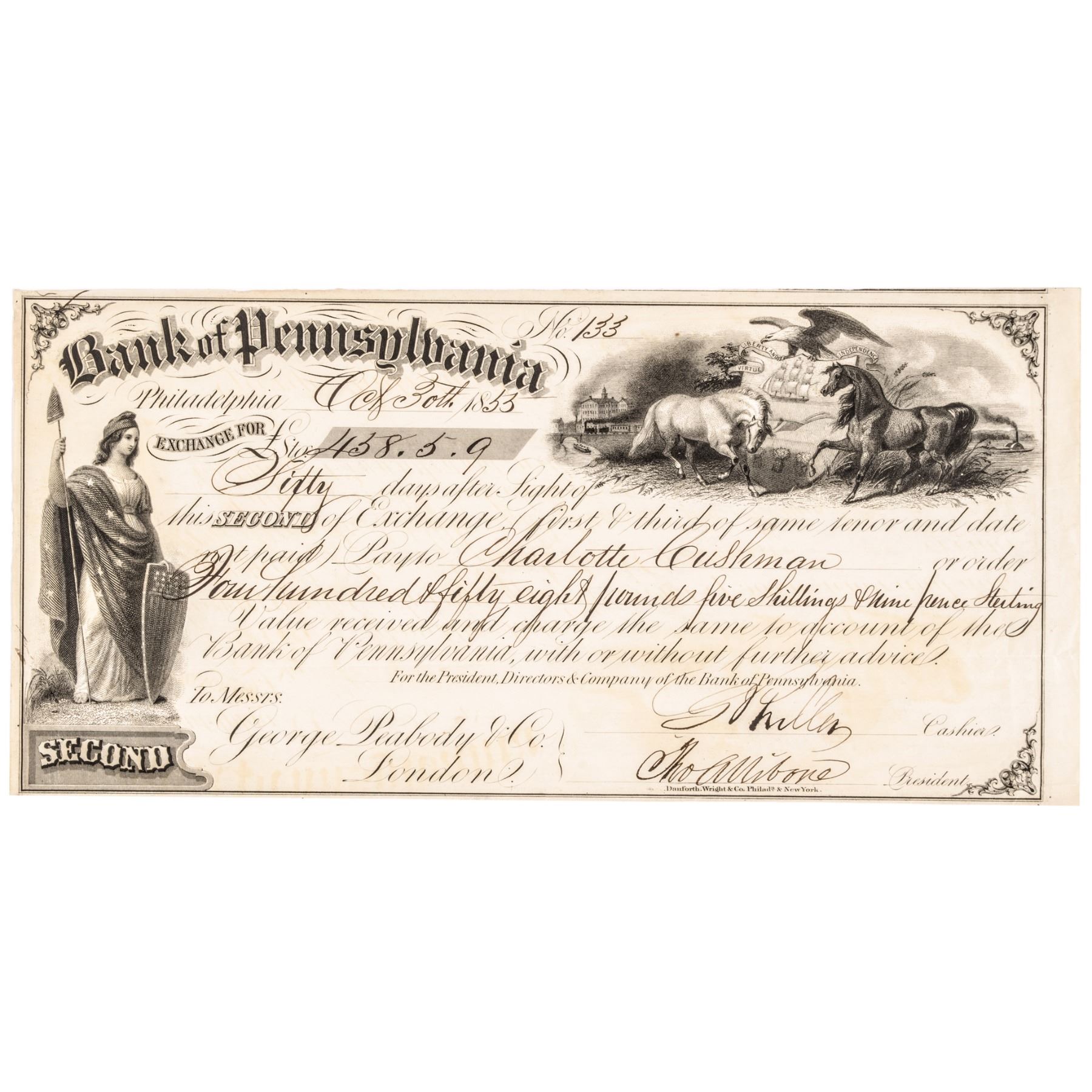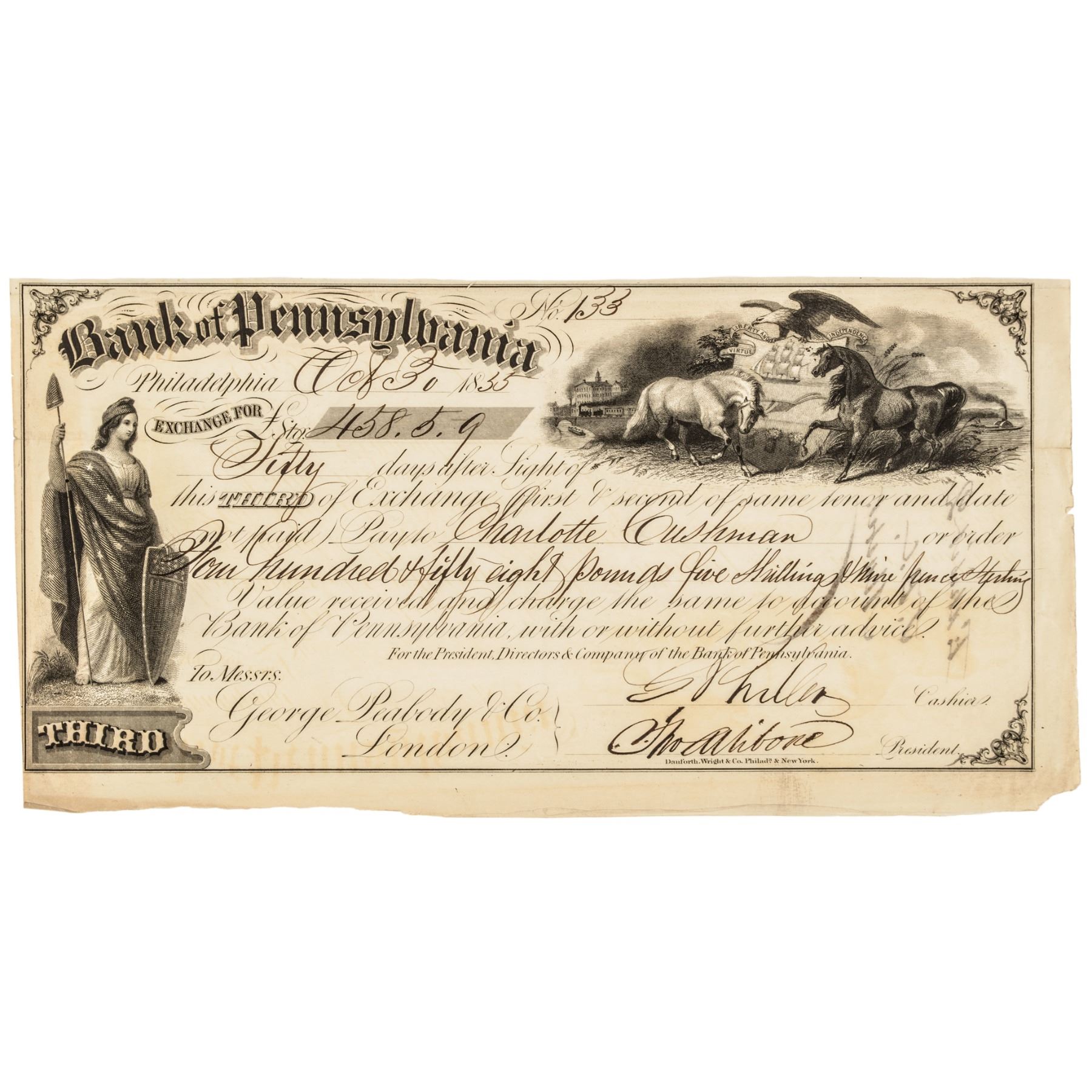 Two Engraved Exchange Forms, in Sterling. Both measure about 9” x 4.5” being a Second and a Third. DW&Co. Left end, Liberty. Top right arms. Both for Charlotte Cushman and in the amount of “Four hundred & fifty eight pounds five Shillings & nine pence Sterling”. Once seen regularly, now becoming quite scarce. (2 items)