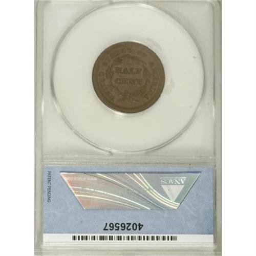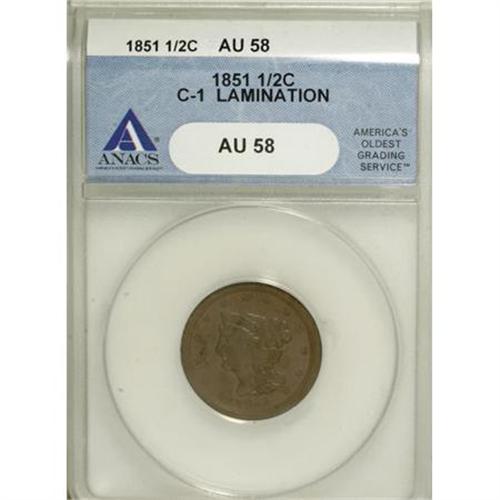 <B>1851 1/2 C Half Cent--Lamination--AU58 ANACS.</B></I> C-1. NGC Census: (70/275). PCGS Population (55/151). Mintage: 147,672. Numismedia Wsl. Price for NGC/PCGS coin in AU58: $150. (#1224)<BR><BR><B>Coin Engraver:</B> Christian Gobrecht<BR><BR><b>Shipping:</b> Coins & Currency (<a target="_blank" href="http://www.heritageauctions.com/common/shipping.php">view shipping information</a>)