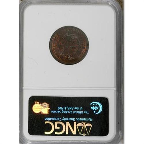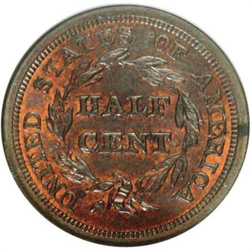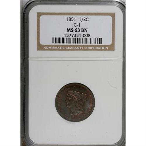 <B>1851 1/2 C MS63 Brown NGC.</B></I> C-1. NGC Census: (75/76). PCGS Population (54/25). Mintage: 147,672. Numismedia Wsl. Price for NGC/PCGS coin in MS63: $267. (#1224)<BR><BR><B>Coin Engraver:</B> Christian Gobrecht<BR><BR><b>Shipping:</b> Coins & Currency (<a target="_blank" href="http://www.heritageauctions.com/common/shipping.php">view shipping information</a>)