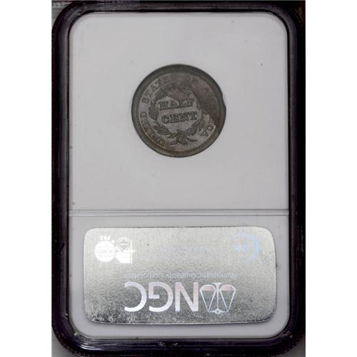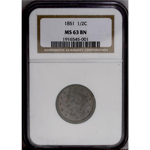 1851 1/2 C MS63 Brown NGC. C-1, B-1, R-1. The base of 1851[1/2 C] MS63 Brown NGC.