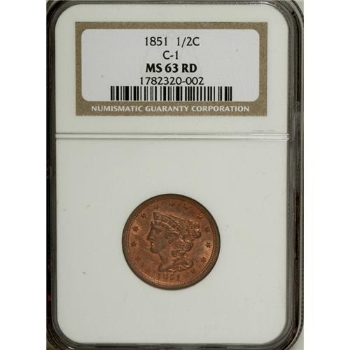 <B>1851 1/2 C MS63 Red NGC.</B></I> B-1, C-1, R.1. Generous amounts of original mint red are noted on both sides of this lovely coin, with some light mellowing on the highpoints, largely on the obverse. A couple of pinscratches are noted on Liberty's cheek and in the field nearby, but much luster remains, and carbon is minimal and only loupe-visible. EAC 64.<BR><BR><b>Shipping:</b> Coins & Currency (<a target="_blank" href="http://www.heritageauctions.com/common/shipping.php">view shipping information</a>)