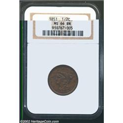 1851 1/2 C MS64 Brown NGC. Medium brown patina covers most of each side with just the slightest trac