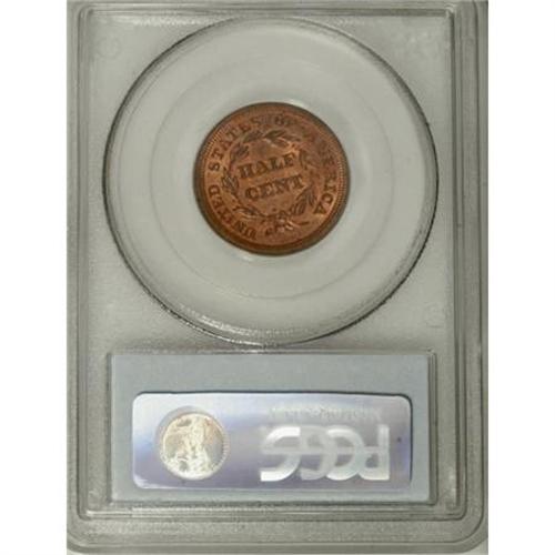 <B>1851 1/2 C MS64 Red PCGS.</B></I> C-1, B-1, R.1. This issue's lone die pair is distinguished by the base of a misplaced 1 to the right of the date. Well struck with a vivid copper-orange reverse and streaks of deeper rose and violet color on the obverse. Population: 4 in 64 Red, 0 finer (7/07). EAC 60.<BR><BR><B>Coin Engraver:</B> Christian Gobrecht<BR><BR><b>Shipping:</b> Coins & Currency (<a target="_blank" href="http://www.heritageauctions.com/common/shipping.php">view shipping information</a>\)