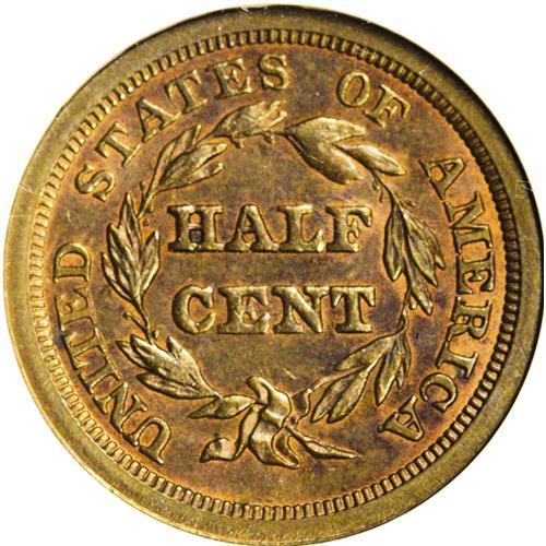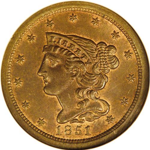 <B>1851<1/2 C> MS65 Red and Brown NGC.</B></I> C-1, B-1, R.1. The base of an errant 1 is punched far to the right of the date. The stars are well defined, however, some minor weakness shows in the upper leaves of the wreath. Subdued crimson luster is especially extensive on the reverse. EAC 60+. Census: 2 in 65 Red and Brown, 0 finer (7/06).