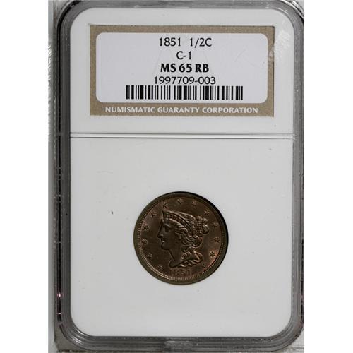 1851 1/2 C MS65 Red and Brown NGC. C-1, B-1, R.1. The