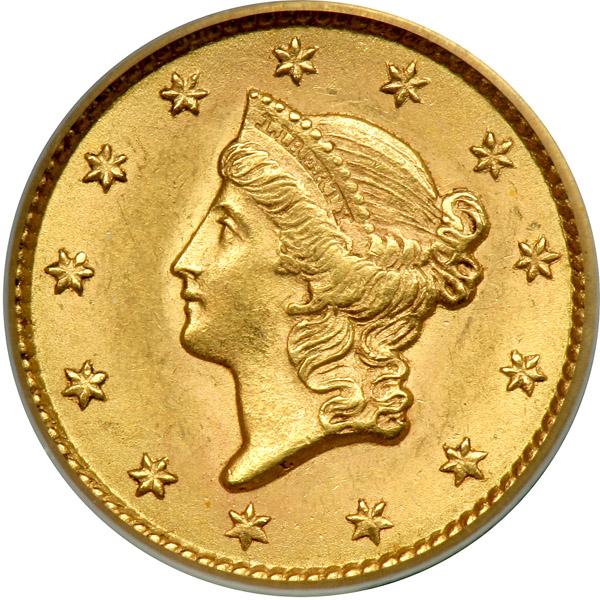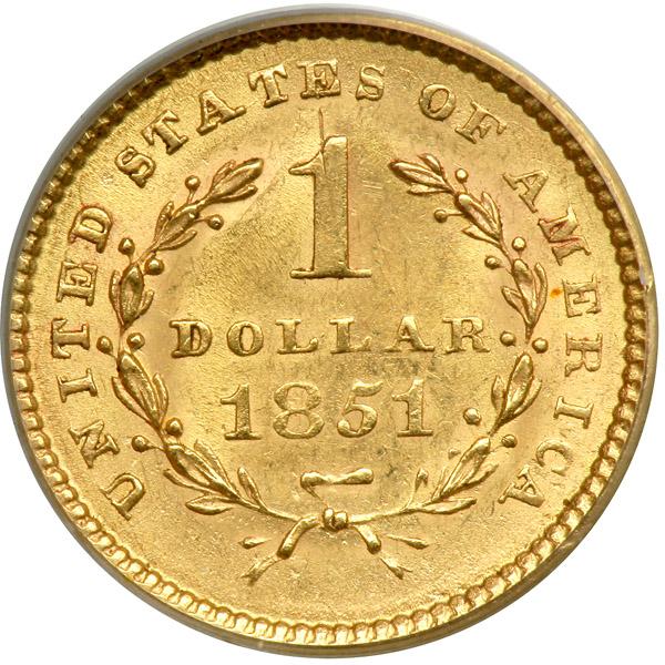 1851 $1 Gold Liberty. PCGS graded MS-63 PQ. CAC Approved. A nice frosty example, one of several select to choice gold dollars featuring the petite Liberty head that was in use from 1849 through 1854 before major modifications were made to the design (PCGS # 7513) .