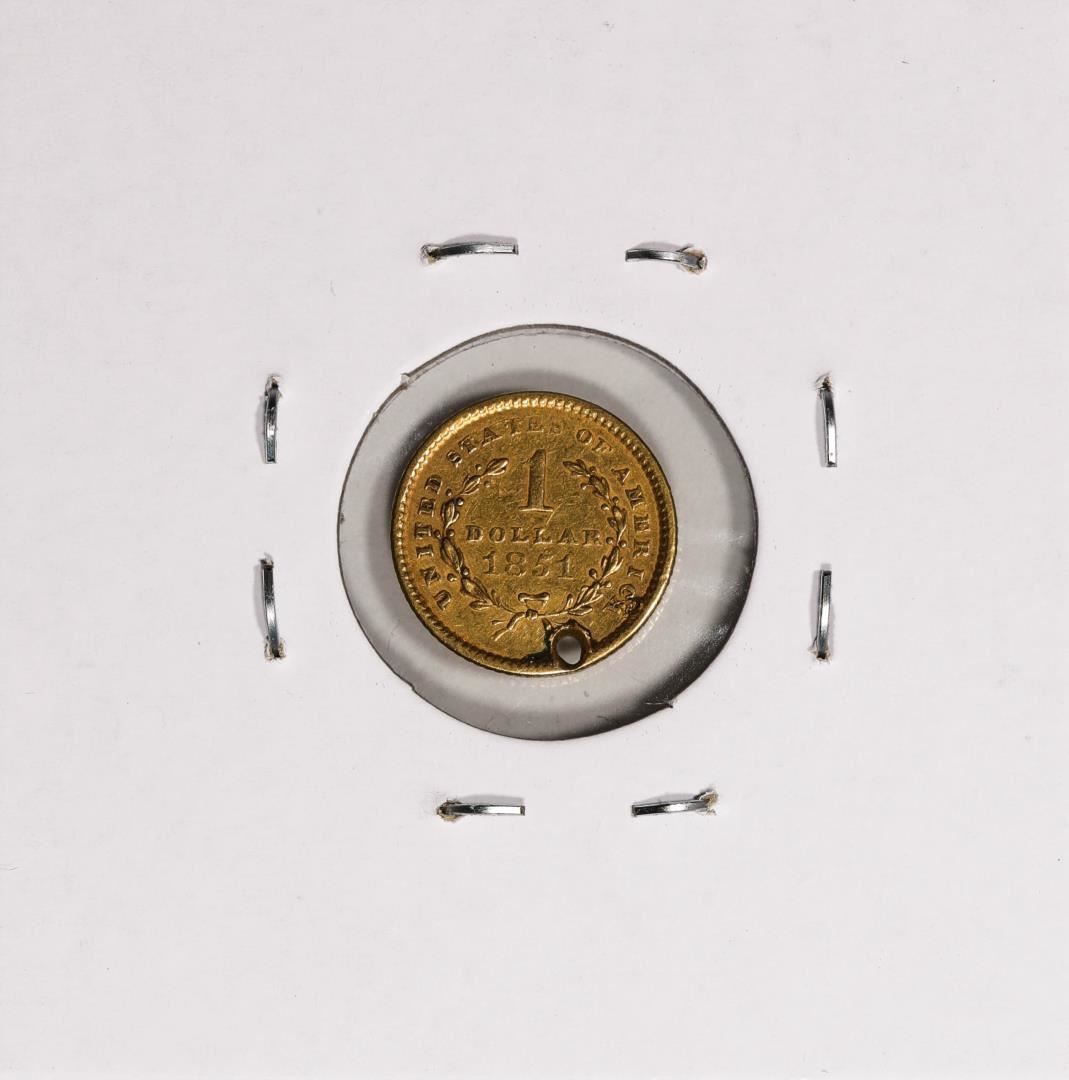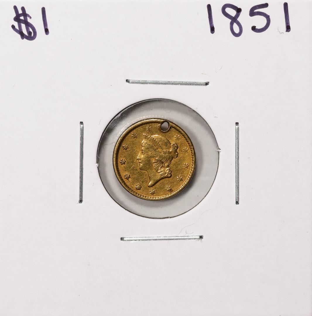 One 1851 $1 Liberty Head Gold Dollar Coin Holed.