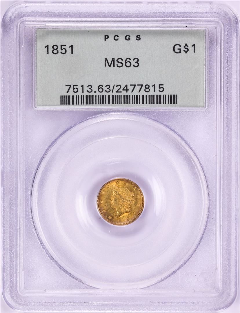 One 1851 $1 Liberty Head Gold Dollar Coin PCGS MS63 Old Green Holder. PCGS Graded.