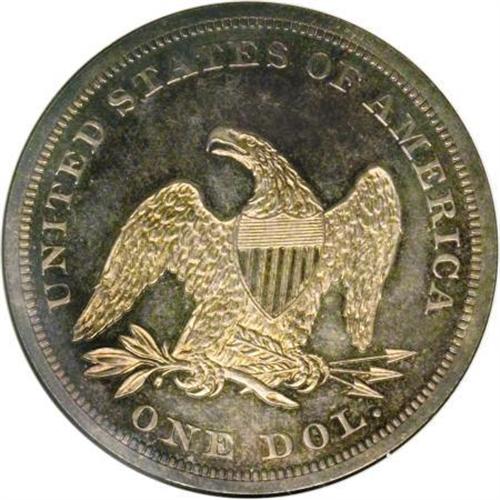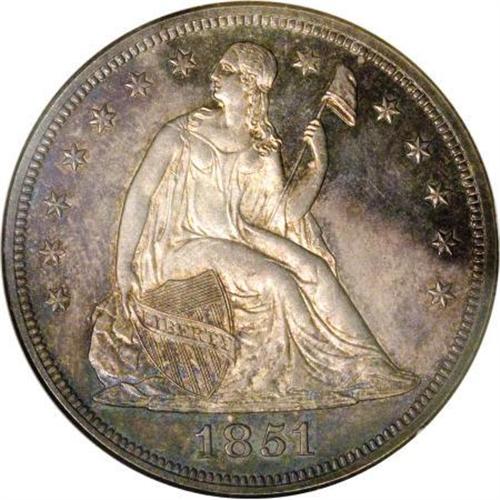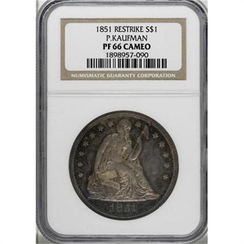<B>1851 $1 Restrike PR66 Cameo NGC.</B></I> Ex: P. Kaufman. The Phil Kaufman 1851 Restrike proof Cameo dollar is the finest of the 45 coins certified by NGC and PCGS, and one of just eight pieces given a Cameo designation. The Restrike silver dollars are sometimes referred to as the "Centered Date" dollars, compared to the higher date position of the Original strikes. It is generally thought that all 1851 Original dollars were produced as business strikes, while all 1851 Restrike dollars were coined as proofs.<BR> Relatively little is known about the origin of these restrikes. Some numismatists hold that Mint employees made them in the late 1850s for personal gain by satisfying collector demand. Another theory is that the Mint purposely made them to provide a trading stock with collectors for additions to its numismatic collection.<BR> Not only is the origin of the 1851 proof Restrike dollars controversial, but so are the mintage and survival estimates. Production estimates range from 30-100 pieces, while the number surviving ranges from fewer than 30 to 60 or more. Based on the certified population of 45 coins, some likely resubmissions or crossovers, and at least 60 or so auction appearances over the last 20 years, many likely duplicates, we put extant specimens in the 25-35 range. The following roster more or less reflects this estimate:<BR><BR><B> 1. PR66 Cameo NGC. The Kaufman piece.</B></I> 1976 ANA Sale (Stack's, 8/1976), lot 1379; 1998 ANA Sale (Heritage, 8/1998), lot 8199.<BR><B> 2. PR65 PCGS. </B></I>Share (Sunshine) Collection (Superior, 9/2003), lot 2089; Rod Sweet Collection (Bowers and Merena, 7/2005), lot 1012.<BR><B> 3. PR64 Cameo NGC.</B></I> The Rarities Sale (Bowers and Merena, 8/1996), lot 228; Dr. Richard Ariagno Collection (Ira and Larry Goldberg, 6/1999), lot 416; Dallas Coin Auction (Heritage, 4/2007), lot 987. A lint mark at star 1 and a spot under F of OF and A of AMERICA are visible on the plates.<BR><B> 4. PR63 NGC.</B></I> The Worrell Collection (Superior, 9/1993), lot 1313.<BR><B> 5. PR63 Deep Cameo PCGS.</B></I> Central States Numismatic Society Sale (Heritage, 5/2005), lot 7368.<BR><B> 6. PR63 Cameo PCGS.</B></I> Charlotte National Money Show sale (Heritage, 3/2007), lot 948.<BR><B> 7. PR62 PCGS.</B></I> The Piedmont sale (Superior, 1/1996), lot 1569; Gainsborough Sale II (Superior, 2/1997), lot 1362. Catalogers say of 1997 appearance: "Previously in PCGS holder."<BR><B> 8. PR62 PCGS.</B></I> The Rarities Sale (Bowers and Merena (9/2002), lot 373. The obverse plate shows a stain-like spot above Liberty's foot.<BR><B> 9. PR62 NGC.</B></I> Richmond Collection II (David Lawrence Rare Coins, 11/2004), lot 1516; Central States Numismatic Society Sale (Heritage, 5/2005), lot 7637.<BR><B> 10. PR62 PCGS.</B></I> The Bunting Collection (Stack's, 10/2007), lot 5256. The obverse plate shows a spot between 1 and 8 at top, and another to the left of star 2 (these are also mentioned by the catalogers).<BR><BR>Additional Appearances<BR> A. Choice Brilliant Proof. James A. Stack, Sr. Collection (Stack's, 3/1995), lot 188; David Queller Family Collection (Stack's, 3/1997), lot 681.<BR> B. Choice Brilliant Proof. The L.K. Rudolf Collection (Stack's, 5/2003), lot 2110.<BR> C. PR63. The Norweb Collection (Bowers and Merena, 11/1988), lot 3798.<BR> D. Brilliant Proof 63. Dr. Jack A. Adams Collection (Superior, 5/1992), lot 2140.<BR> E. PR63 PCGS. Kenneth C. Long Collection (Bowers and Merena, 5/1995), lot 1223.<BR> F. PR63 PCGS. The Rarities Sale (Bowers and Merena, 7/2005), lot 703.<BR> G. PR63 PCGS. The Glode M. Requa Collection (American Numismatic Rarities, 9/2006), lot 445.<BR> H. PR60. The Louis E. Eliasberg, Sr. Collection (Bowers and Merena, 4/1997), lot 2219.<BR> <BR> Elegant cameo contrast on Kaufman's Premium Gem jumps out at the viewer, regardless of the angle of observation. The m+¬lange of delicate cobalt-blue, lavender, and champagne-gold patina in the fields fails to diminish either their reflectivity or their elegant cameo contrast. Light gold central devices serve to heighten even more the field-motif variance, enhancing the already stunning eye appeal. A well executed strike sharpens the design elements, save for minor softness on the centrils of the upper two stars. Finally, impeccably preserved surfaces leave little in the way of pedigree identifiers. Only an inoffensive spot beneath the ER of AMERICA and another under RI provide minimal help in this regard.<BR><I>From The Phil Kaufman Collection of Early Seated Proof Sets, Part Three.</B></I><BR><BR><b>Shipping:</b> Coins & Currency (<a target="_blank" href="http://www.heritageauctions.com/common/shipping.php">view shipping information</a>)