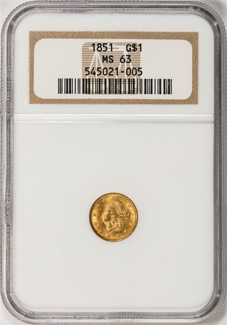 One 1851 $1 Type 1 Liberty Head Gold Dollar Coin NGC MS63. NGC Certified.