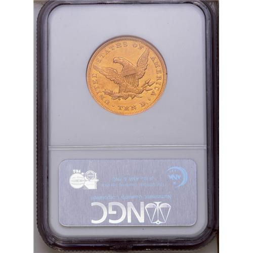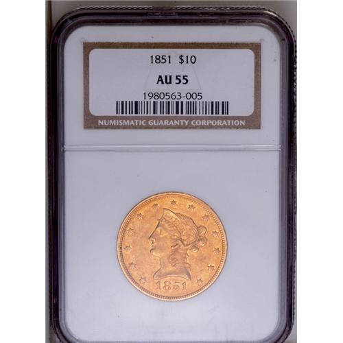 <B>1851<$10> AU55 NGC.</B></I> A pleasing lemon-gold example of this scarce No Motto issue. The major devices are sharply struck, although a few stars are soft. The obverse die is slightly misaligned toward 5 o'clock.