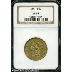 <B>1851 $10 AU58 NGC.</B></I> Original, subdued orange-gold surfaces and well defined throughout with no obvious abrasions. Lot:8742