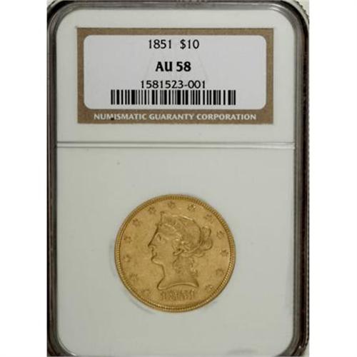 <B>1851 $10 AU58 NGC.</B></I> Circulated examples of the 1851 ten dollar are available through AU50, after which the rarity increases dramatically. Well struck, with yellow-gold surfaces that are lightly abraded. Luster resides in the recesses of both sides. Census: 34 in 58, 19 finer (8/07).<BR><BR><B>Coin Engraver:</B> Christian Gobrecht<BR><BR><b>Shipping:</b> Coins & Currency (<a target="_blank" href="http://www.heritageauctions.com/common/shipping.php">view shipping information</a>)