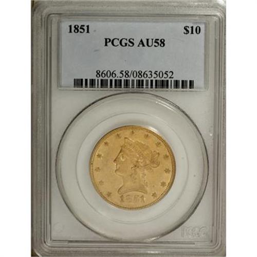 <B>1851 $10 AU58 PCGS.</B></I> The 1851 ten is a surprisingly scarce issue considering its mintage of 176,328 pieces. This well-preserved example has even orange-gold coloration and significant luster remaining around the devices. Sharply struck in the centers with slight softness noted on the peripheral stars. An attractive near-Mint piece with no singularly mentionable flaws.<BR><BR><B>Coin Engraver:</B> Christian Gobrecht<BR><BR><b>Shipping:</b> Coins & Currency (<a target="_blank" href="http://www.heritageauctions.com/common/shipping.php">view shipping information</a>)