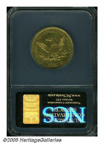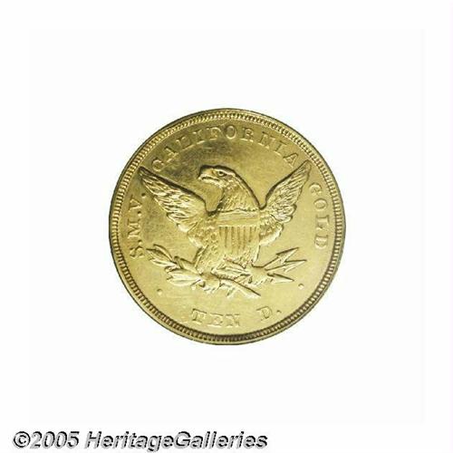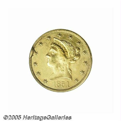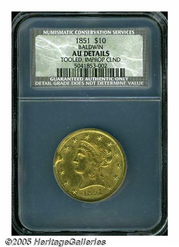 <B>1851<$10> Baldwin Ten Dollar AU Details, Tooled, Improperly Cleaned, NCS.</B></I> K-4, High R.6. The firm of Baldwin & Co. joined the ranks of other "less desirable" private minters after an unfavorable assay report in March 1851 showed their ten dollar coins to contain only $9.74 in value. It is a curious coincidence that today the firms that were least respected in Gold Rush California are held in the greatest respect by collectors today. Obviously, this is because the coins from these "lightweight" companies were melted in the 1850s and converted into coin form that was more acceptable for use in general commerce, making survivors in any grade extremely rare today. These ten dollar pieces imitating the Federal design are rarer than the more popular "cowboy" design of the same company. Baldwin tens are always weak in the centers as they were struck from convex dies. This weakness is even more pronounced on this coin as it has been tooled in this area as well as the left obverse field. The surfaces are unusually bright from heavy cleaning with just a hint of reddish patina around the peripheries. An interesting die cud is seen between star 4 and the rim, a feature that is unlisted in the Kagin reference.Listed on page 302 of the 2005 <I>Guide Book. </B></I><BR><I>From The Great Western Collection of Territorial Gold.</B></I>