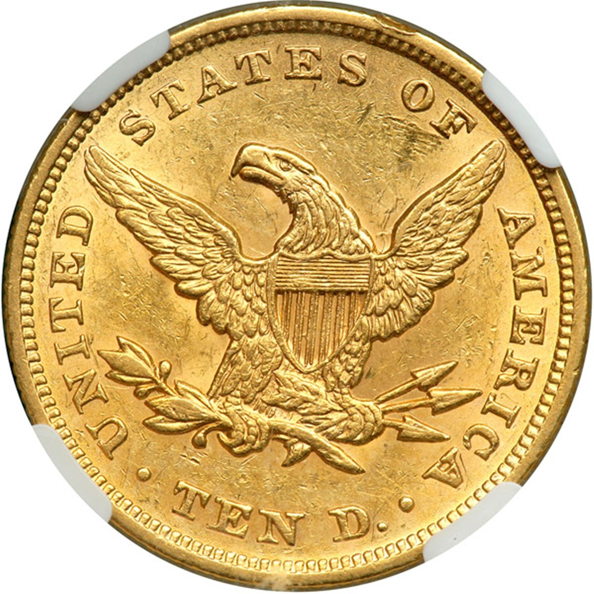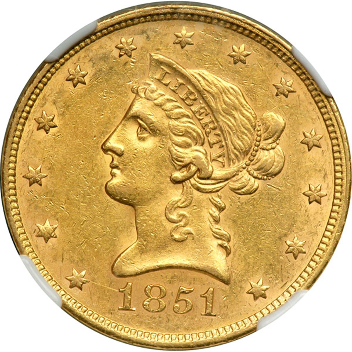 1851 $10 Liberty. NGC graded AU-55. Well struck and untoned. A still lustrous example of the kind of quality one likes to describe for bidders of this actively collected No Motto Liberty $10 design. Survivors are rarely seen in grades higher than Extremely Fine. The nice luster blends easily with pale golden highlights on the pleasingly smooth surface. Pop 68; 66 finer (PCGS # 8606) .