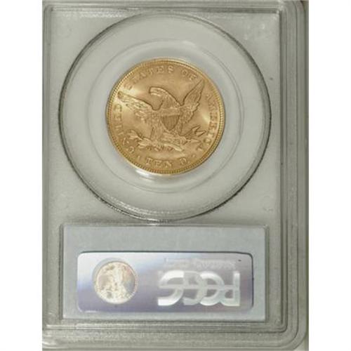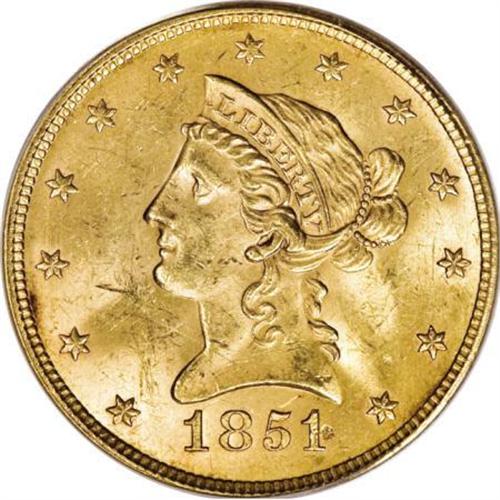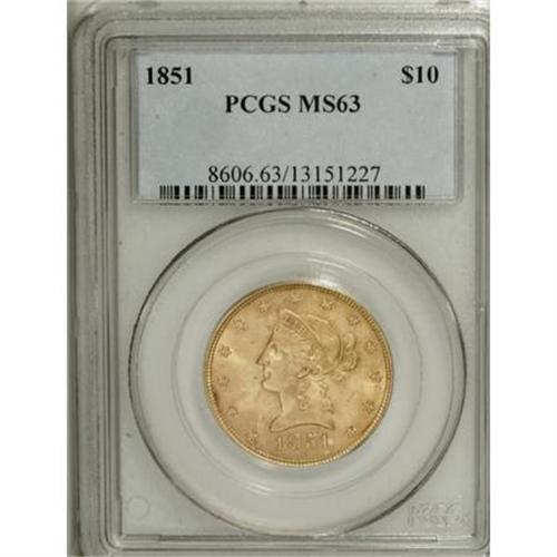 <B>1851 $10 MS63 PCGS.</B></I> The 1851 ten dollar is difficult to acquire in all grades, with the most available specimens grading Very Fine through the lower levels of About Uncirculated. Mint State coins are quite rare. PCGS and NGC have certified fewer than 30 Uncirculated examples, primarily in the MS60 to MS62 range.<BR> Glowing luster exudes from the peach-gold surfaces of the Select example in this lot, and a solid strike manifests itself in sharp and uniform definition on the design elements. A few minute marks prevent the attainment of a higher grade. Population: 2 in 63, 1 finer (6/07).<BR><BR><B>Coin Engraver:</B> Christian Gobrecht<BR><BR><b>Shipping:</b> Coins & Currency (<a target="_blank" href="http://www.heritageauctions.com/common/shipping.php">view shipping information</a>\)