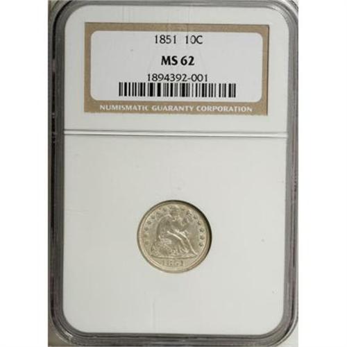 <B>1851 10C MS62 NGC.</B></I> NGC Census: (6/22). PCGS Population (4/18). Mintage: 1,026,500. Numismedia Wsl. Price for NGC/PCGS coin in MS62: $471. (#4595)<BR><BR><B>Coin Engraver:</B> Christian Gobrecht<BR><BR><b>Shipping:</b> Coins & Currency (<a target="_blank" href="http://www.heritageauctions.com/common/shipping.php">view shipping information</a>)