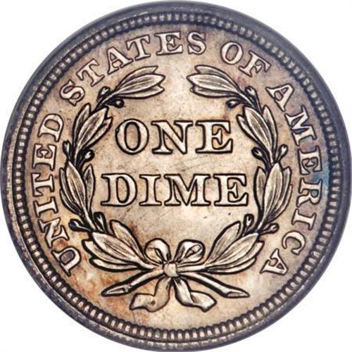 <B>1851 10C MS64 PCGS.</B></I> This Choice Mint State piece exhibits outstanding silver-gray with iridescent toning accents on each side. The reverse is brighter in overall appearance. It is sharply defined, including full stars, strong head details, and bold branches. A delightful and elusive coin. Population: 9 in 64, 5 finer (1/08).<BR><BR><B>Coin Engraver:</B> Christian Gobrecht<BR><BR><b>Shipping:</b> Coins & Currency (<a target="_blank" href="http://www.heritageauctions.com/common/shipping.php">view shipping information</a>)