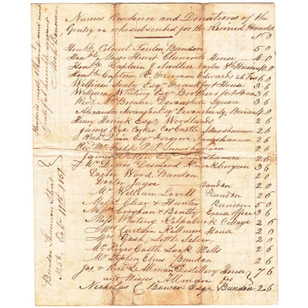 A letter written by schoolmaster Mick Donovan from Shannon Street, Bandon, seeking financial support for a publication of poetry describing his experiences during the Famine period. The letter also describes his own personal situation "... before the failure of the potato crop I supported myself independently as a schoolmaster, but since the commencement of that fatal visitation I regret to say that my school dwindled away to utter insignificance... I have now compleated a poetical treatise called `The Ruined Hamlet` it most feelingly describes the prostration of trade the depression of the agricultural interest and the manifold evils resulting from the abovementioned national calamity...". The letter concludes with a list of members of the gentry who have given money towards the cost of publication. There appears to be no record of the publication of the poem.